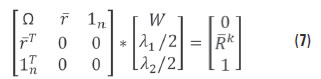 Para encontrar los valores de wi o los elementos del vector W, que minimizan la varianza del portafolio, dado un nivel de rendimiento esperado de la cartera, se despeja W, λ1/2 y λ2/2 quedando el anterior sistema así: