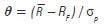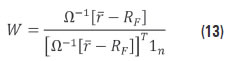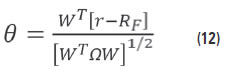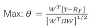 Donde Rf es un vector cuyos n elementos son iguales a la tasa libre de riesgo, y θ es la pendiente de la recta. Entonces, para encontrar el punto tangente entre la línea recta con un origen en Rf y el conjunto de mínima varianza, se deben estimar los elementos de la matriz W, que maximizan la pendiente de la recta: