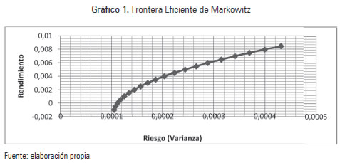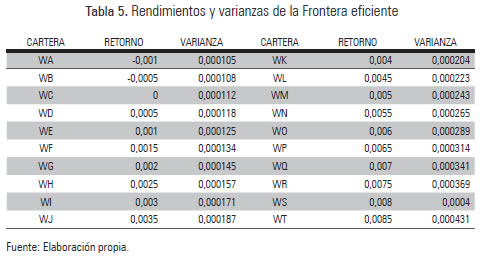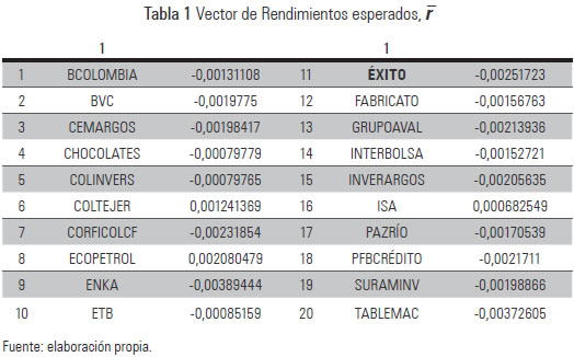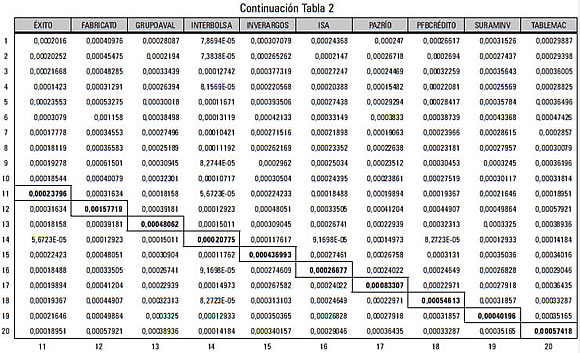 Los resultados de esas estimaciones se muestran en la diagonal principal de la matriz de varianzas y covarianzas (representada como Ω) que está en la Tabla 2. De la matriz se puede observar que la acción con mayor varianza durante el período fue COLTEJER con un valor de 0,00173809, una de las tres acciones con rendimientos medios positivos. Le sigue FABRICATO, con un valor de 0,00157719 y PAZRÍO con 0,00083307.