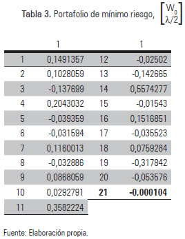 Donde el elemento de la fila 21 corresponde a λ/2 y por tanto, los primeros 20 elementos son las ponderaciones de cada título, en el portafolio de mínimo riesgo. Además, los elementos negativos indican la realización de ventas en corto.