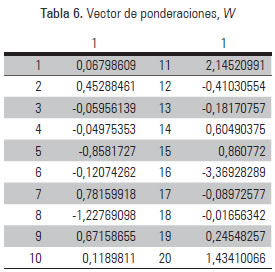 Utilizando el dinero como activo sin riesgo con una tasa de rendimiento del 0%, cifra que no es esencial debido a que lo importante es el diferencial entre la tasa de rendimiento esperada de los activos riesgosos y la tasa libre de riesgo (Tobin, 1958, p. 67), y encontrando la solución de (13) con RF = 0%, se obtiene el siguiente vector de ponderaciones:
