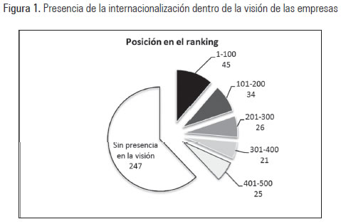 Luego de realizar una clasificación binaria de la visión de las empresas en la muestra, se encontró que 151 empresas —37,9% del total de la muestra— han establecido claramente la internacionalización como una prioridad estratégica. Dichas empresas se encuentran distribuidas en el ranking de la siguiente manera (Figura 1):