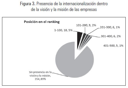 Al analizar simultáneamente la presencia de la internacionalización como fin (visión) y como medio (misión), se encontró que tan solo 44 empresas (11,1%) han incluido este tema claramente tanto en su visión como en su misión; es decir, el 88,9% de las empresas no lo han incluido. Para estas empresas, la distribución dentro del ranking es la siguiente: