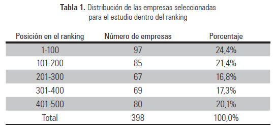 Es importante aclarar que para las empresas no incluidas en el estudio, no necesariamente se debe a que no tengan una misión y visión, sino al hecho de no tenerlo publicado en su página web o no haber proporcionado la información solicitada vía telefónica. Esto implica que el presente estudio excluye 92 empresas del ranking de las 500 empresas más grandes de Colombia por no haberse encontrado información disponible para el análisis, más 10 empresas cuya visión y misión son idénticas a las de otras empresas del mismo grupo empresarial que ya están incluidas dentro de la muestra. Así, el presente estudio, considera una muestra total de 398 empresas (Ver Tabla 1).