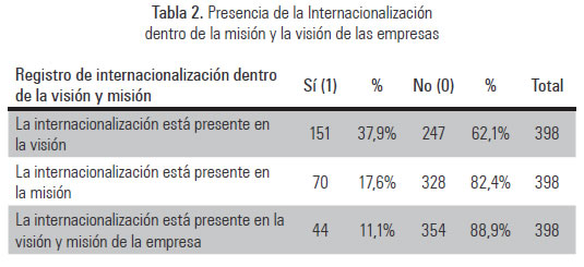 Un total de 398 registros fue analizado con el fin de identificar si la internacionalización aparece como objetivo estratégico de las empresas más grandes de Colombia o no. Del total de la muestra analizada se encontró, luego de clasificar los enunciados correspondientes a la visión y la misión de la empresa, que tan solo 151 (37,9%) empresas han incluido este tema explícitamente dentro de su visión, 70 (17,6%) la han incluido en su misión, mientras que tan solo 44 empresas (11,1%) tienen claramente definida la internacionalización como parte fundamental de su visión y su misión (Ver Tabla 2).