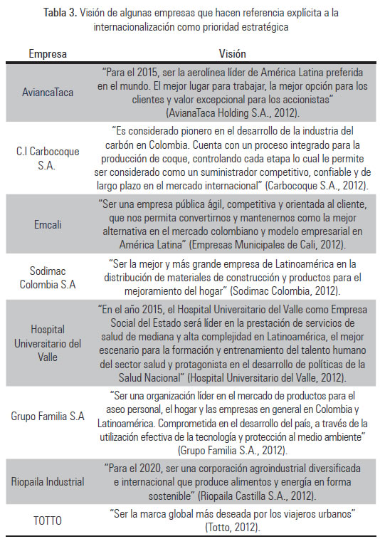 La visión proporciona guía y direccionamiento a la organización, define su carácter e identidad, su norte (Verma, 2009). En la Tabla 3 se presenta la visión de algunas empresas que hacen referencia explícita a la internacionalización como prioridad estratégica: