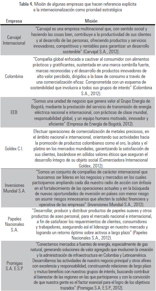 La misión provee los fundamentos para las prioridades, estrategias, planes y asignaciones, a la vez que especifica para qué existe la organización (Pearce & David, 1987). En la Tabla 4 se presenta la misión de algunas empresas que hacen referencia explícita a la internacionalización como prioridad estratégica: