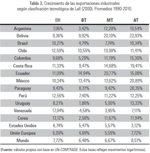 La desagregación de las exportaciones de manufacturas con base en la clasificación de Lall (2000) encuentra que el activo crecimiento de las exportaciones de mediana (MT) y alta tecnología (AT) que registró el mundo en este período fue parcialmente recogido en América Latina. En el grupo LAC 12, con excepción de Uruguay en MT y Venezuela en AT y MT, todos tuvieron ascensos por encima de los registrados en estas categorías por EE.UU., la U.E. y por el mundo (Tabla 3). Esta situación cobijó también, con la excepción de Argentina, los crecimientos de las exportaciones de manufacturas basadas en recursos naturales (BR). En el caso de las exportaciones de manufacturas de baja tecnología (BT) Argentina, Brasil, Colombia, Uruguay y Venezuela crecieron por debajo de las exportaciones mundiales. En principio se podría afirmar, con las excepciones señaladas, que los datos de crecimientos de las exportaciones de manufacturas por grandes subsectores reflejaron un lento proceso de industrialización de las exportaciones latinoamericanas.