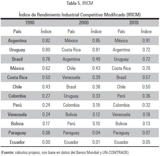 12 Los cuatros componentes son normalizados de modo tal que el país que tiene el mayor valor recibe el valor uno, mientras que el dato del país que presentó el menor valor queda en cero. El IRICM es el promedio simple de los cuatro componentes normalizados.