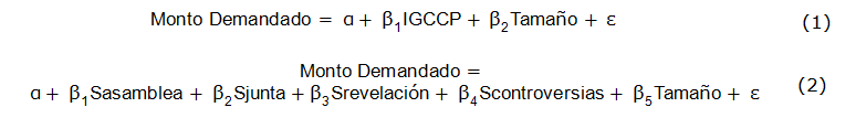 Se utiliza el siguiente modelo de regresión para determinar si existe alguna relación entre la aplicación de prácticas de gobierno corporativo y el monto demandado en cada emisión de títulos valores realizada. En el modelo presentado en la ecuación (1) se estudia la relación con el IGCCP, mientras que en el modelo de la ecuación (2) se examina esta relación bajo los cuatro subíndices del IGCCP de forma específica.