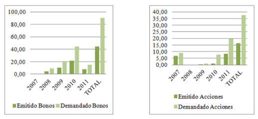 Frente a la demanda por bonos y acciones se puede observar que el mercado de valores colombiano es un mercado ávido de títulos valores. En la Gráfica 3 se evidencia que las acciones son en promedio más apetecidas que los bonos, durante el periodo estudiado las acciones son más demandadas en los años 2009, 2010 y 2011; en relación a la demanda presentada por bonos, este comportamiento se invierte en el 2007, donde los bonos son más demandados que las acciones, y en el 2008, debido a que no se realizaron emisiones de acciones.