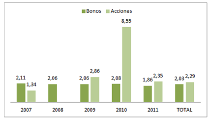 Considerando los montos emitidos durante el periodo 2007-2011, los bonos conservan la tendencia frente a las acciones; en la muestra estudiada representan el 73,02% de las emisiones (44,56 billones), correspondiendo el restante 26,98% a la emisión de acciones (16,46 billones). Sin embargo, en el 2011 el monto de acciones emitidas es superior (8,35 billones) en comparación al monto de bonos emitidos (8 billones), no obstante, la emisión de dichas acciones está concentrada en cinco emisores.