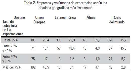 Finalmente, y con el fin de identificar y describir las barreras a la exportación percibidas con mayor frecuencia por las empresas españolas participantes en el estudio en función del destino mayoritario de sus exportaciones, se realizaron análisis de frecuencias absolutas y relativas, y se calcularon estadísticas que incluyen medidas de tendencia central (e. g. media, mediana y moda) y de dispersión (desviación estándar y desviación cuartil). Para la consideración de empresas exportadoras según cada uno de los destinos geográficos, el análisis se limitaba exclusivamente a aquellas empresas que destinaban más del 50% del total de su exportación a uno de los cuatro destinos geográficos señalados: Latinoamérica, la Unión Europea, África y el resto del mundo (Tabla 2).