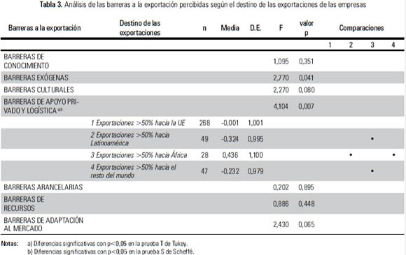 No se encontraron diferencias significativas entre las empresas y los principales mercados de destino en cuanto a la percepción de barreras de conocimiento (p = 0,35), barreras culturales (p = 0,08), barreras arancelarias (p = 0,89), barreras de recursos (p = 0,44) y barreras de adaptación al mercado (p = 0,06). Por lo que respecta a las barreras exógenas, si bien el análisis ANOVA one-way detecta la existencia de diferencias (p = 0,04), ni la prueba T de Tukey ni la prueba S de Scheffé mostraron diferencias significativas entre este tipo de barreras y las exportaciones a los mercados de destino especificados. Por el contrario, los análisis realizados señalaron la existencia de una conexión estadística entre las barreras de apoyo privado y logística, y los mercados de destino, confirmada, además, por la prueba T de Tukey y la prueba S de Scheffé, con un nivel de significación inferior al 5%, obteniéndose diferencias significativas (p<0,007) entre ellas.