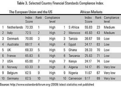 It is widely recognized that global financial stability rests on robust national systems, and therefore requires enhanced measures at the country level. (ROSC Uganda 2008, p.1). In a world of integrated capital markets, financial crises in individual countries can imperil international financial stability. This provides a basic “public goods” rationale for minimum standards, which benefit international and individual national systems. In this context, the World Bank and the International Monetary Fund (IMF) initiated the Reports on the Observance of Standards and Codes (ROSC), which cover twelve internationally recognized core standards and codes relevant to economic stability and private and financial sector development. The Financial Standards Compliance Index is made up of 12 key standards covering macroeconomic policy and data transparency, institutional market infrastructure and financial regulation and supervision. Africa has not fared well on these standards as can be seen in the table below. It can be seen that only two countries in Africa achieved a medium score while the other eight score 'low' and 'very low'. Since this data relates to some of the top economies in Africa, it can be argued that the financial standards compliance index is quite low meaning the 12 indicators above have not been sufficiently complied with. This is in total contrast to the EU and the US where the compliance index is considered high (See Table 3).