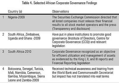 Under NIFA, the principles and policies that foster the development of stable, efficient financial systems include corporate governance. The findings of this study are based on the implementation status of corporate governance codes that indicate material items to be reported upon. Most codes expect that a report on good corporate governance should ensure timely and accurate disclosures of all material information regarding the corporation to stakeholders. Generally and around the world, the key contents of corporate governance codes include compliance with guidelines on corporate governance codes and reasons for non compliance, establishment of board and board committees, supply and disclosure of information, election of directors, resignation of directors, AGM's, a balanced board, best practices relating to the rights of shareholders and an effective audit committee. It is however noted that good corporate governance may not survive in a place where country governance is still questionable. Governance in African countries has in many instances not measured up to many global standards and this has contributed to poor corporate governance. Some African countries have been under military rule or non-democratic civilian governments (Zimbabwe) and this has not helped corporate governance either (See Table 4).