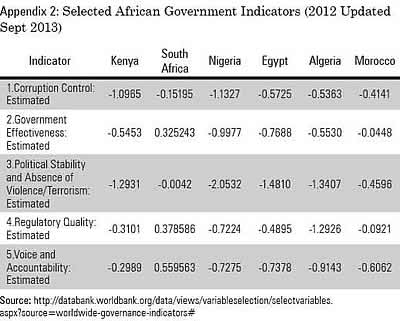 The African case is important. Questions have been raised as to whether Africa is still a dark continent given the continuing increases in foreign direct investment (the highest in any developing region), the recent hosting of the World Cup in South Africa and the discovery of oil and gas in Uganda, Kenya and Tanzania. It is estimated that Africa's GDP in 2008 stood at $1.6 trillion, equivalent to that of Brazil and Russia. The McKinsey quarterly report (2010) indicated that about half of Africa's 1 billion populations will live in cities in 2030. 18 top cities in Africa will have a combined purchasing power equal to 8% of the total Africa GDP. Since 2005 GDP growth on the continent has averaged 5.1% and the World Bank and many other development institutions have recognized Africa as the area for growth given Europe and the US are not registering major growth projections. Moreover, oil, gas and other minerals continue to be discovered in the continent while service industries are now major part of the GDP. The five top economies include South Africa, Nigeria, Egypt, Algeria and Morocco while the fastest growing ones include Ethiopia (7.5%), Mozambique (7.2%), Tanzania (6.8%), Congo (6.5%), Ghana (9%) and Zambia (7.6%) in 2013 see appendix 1 and 2. Even though growth rates in Africa have been criticized as excluding equity and wealth distribution, this unequal distribution mars progress and has been a source of many upheavals. Some corporate leaders have suggested that African economic growth will not be sustainable if the continent does not improve its reputation for corporate governance (Ramalho, 2013) and that Africa's growth will be real only if it develops strong companies able to compete successfully in their home and overseas markets and that is best achieved through good corporate governance. Keeping Africa on governance trajectory is therefore timely as the anticipated and currently dismal wealth situation needs to be managed well and in the best interest of society so as to reach the predicted middle-income status by 2050.