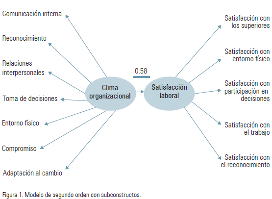 Enfocando el análisis en el segundo modelo de medida, y con relación al modelo estructural, se obtuvo una correlación significativa (p<0,01) de 0,586 entre los constructos de clima organizacional y satisfacción laboral, lo que corrobora y permite aceptar la hipótesis planteada.