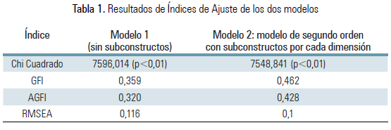El segundo modelo tampoco presenta un buen ajuste, como se puede corroborar en los valores expuestos en la Tabla 1, aunque son superiores los valores de los índices GFI, AGFI y RMSEA del primer modelo analizado, por lo que se puede decir que presentan un mejor ajuste que el anterior; sin embargo, aunque todas las cargas factoriales del segundo modelo fueron mayores a 0,7, muchas de ellas no fueron significativas. Este modelo se muestra en la Figura 1:
