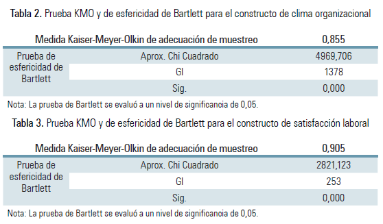 Las Tablas 2 y 3 muestran los resultados de las pruebas de Kaiser-Meyer-Olkin (KMO) relacionados a la adecuación de la muestra y la prueba de esfericidad de Bartlett. Los resultados indican que el coeficiente KMO es mayor al nivel aceptado de 0,7 (Hutcheson & Sofroniou, 1999). La prueba de esfericidad de Bertlett también indica que es posible realizar este tipo de análisis (p<0,05).