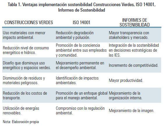 En materia de implementación de sostenibilidad, existen tres aproximaciones metodológicas que permiten señalar que las IES van por el camino correcto: construcciones verdes, ISO 14001 (Alshuwaikhat & Abubakar, 2008) y los informes de sostenibilidad. Para las dos primeras, existen evidencias del menor impacto ambiental con su incorporación en los escenarios estratégicos de las IES en Europa, Estados Unidos, Australia, Asia, Suramérica y África (Simkins & Nolan, 2004), y para el tercero, se evidencian mejoras en el relacionamiento con grupos de interés, reputación y competitividad (WBCSD, 2002). La Tabla 1 muestra las ventajas de las aproximaciones en materia de implementación de la sostenibilidad.