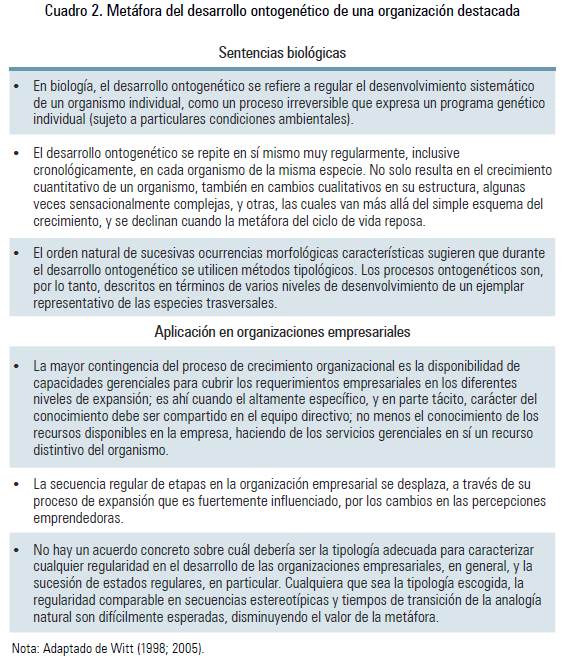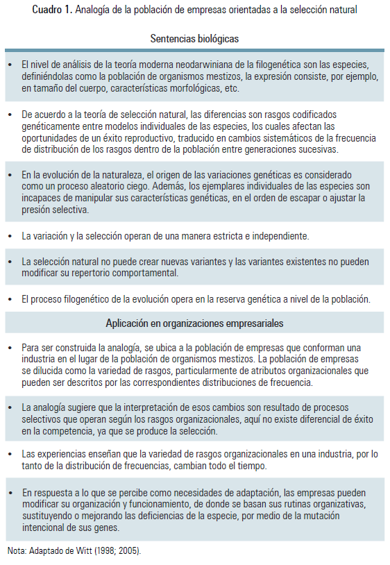Sin embargo, para extender la apreciación, de acuerdo con Witt (2005), se requiere que las analogías o metáforas traídas desde la biología para su ejecución en las empresas se bifurquen en dos enfoques: primero, la analogía de la población orientada a la selección natural (ver Cuadro 1) y, segundo, el enfoque basado en la metáfora del desarrollo ontogenético de un organismo destacado (ver Cuadro 2). Los cuadros indican sentencias biológicas que se yuxtaponen con su aplicabilidad en organizaciones empresariales. Otra valoración destacable, desarrollada por Dobson, Breslin, Suckley, Barton y Rodriguez, (2013), describe la evolución de genotipos a través de la selección de fenotipos, en donde el genotipo representa información inherente de un individuo sobre sus padres (estos son genes) y el fenotipo como expresión desarrollada de un genotipo en un ambiente en particular, que se manifiesta a través de características físicas de los organismos. Estos académicos toman los conceptos abstractos de replicador, con el objeto de explicar el proceso innovador de las pequeñas empresas, e interactuante, como el organismo que replica innovaciones.