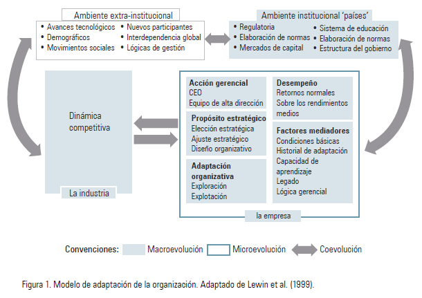 Como se ha enmarcado, la coevolución tiene como principal eje de aplicación los escenarios empresariales, a la adaptación de sus organizaciones, en este aspecto, Lewin, Long y Carroll, (1999) desarrollaron un modelo de adaptación de la organización (ver Figura 1), en el cual basan parte de su dinámica los conceptos de exploración, que involucran experimentación con ideas, paradigmas, tecnologías, estrategias y conocimiento; con la esperanza de encontrar nuevas alternativas que sean superiores a prácticas obsoletas, en contraste, la explotación es asociada con el razonamiento sistemático, la aversión al riesgo, definición y medición del desempeño, esta, además, intenta mejorar las capacidades de existencia, procesos y tecnologías, como la racionalización y disminución de costos.