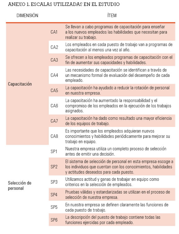 Para la medición de la capacitación, se incluyeron en un principio ocho ítems relativos a la frecuencia con la que los empleados van a programas de capacitación, si estos la reciben al ingresar a la empresa y si esta ha ayudado a reducir la rotación en la entidad (Delery & Doty, 1996). En el caso de la selección de personal, se utilizaron seis ítems referentes a la utilización de sistemas para seleccionar el personal, así como las características que se utilizan para definir las necesidades de cada puesto (Masood, 2010). Por su parte, la compensación fue medida mediante nueve ítems referidos a las recompensas que la empresa ofrece a sus empleados por el logro de los objetivos propuestos (Masood, 2010; Singh, 2004).