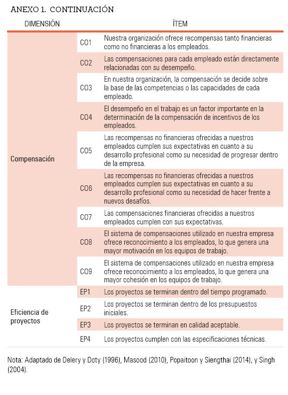 La última práctica elegida para esta investigación es la compensación, debido a que investigadores han encontrado en diferentes estudios que esta práctica favorece la eficiencia de los proyectos al lograr una mayor motivación y cohesión en los equipos de trabajo, lo que conlleva a que se trabaje de manera efectiva en la solución de problemas y, así, alcanzar los objetivos de cada proyecto (Chan et al., 2001; Papke-Shields et al., 2010; Popaitoon & Siengthai, 2014; Project Management Institute, 2013).