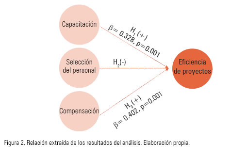 Asimismo, analizando el coeficiente R2 corregido, se puede afirmar que, al contemplar las dos prácticas de gestión de recursos humanos encontradas en la investigación, es posible explicar el 25,5% de la eficiencia de los proyectos de las empresas que forman parte de la muestra en este estudio. Aunque este porcentaje no es demasiado elevado, lo relevante, entre otros aspectos, es que el modelo resulta estadísticamente significativo, teniendo en cuenta que existe otra serie de variables explicativas de la eficiencia de los proyectos, tanto externas (ambiente económico, cliente, competencia, subcontratistas), como internas (habilidades de los gerentes de proyectos, tamaño y valor del proyecto, estructura organizacional del proyecto, entre otros).
