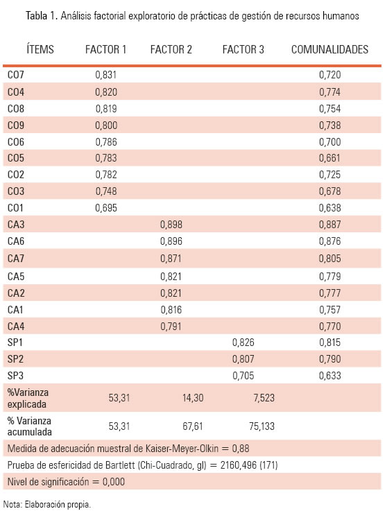 En la Tabla 1 se muestran los resultados de las pruebas realizadas para las prácticas de gestión de recursos humanos, iniciando el análisis con las pruebas de pertinencia y obteniendo buenos resultados tanto para la medida de adecuación muestral KMO y el test de esfericidad de Bartlett, con una significación de 0,001. Como se aprecia en la misma tabla, las comunalidades son muy próximas a la unidad, por lo que se garantiza un alto grado de fiabilidad en los resultados.