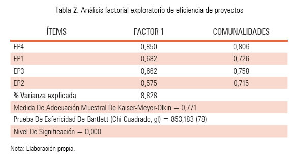 Finalmente, la variable dependiente del modelo se ha hecho operativa a través de cuatro ítems. En la Tabla 2 se muestran los resultados del AFE, del cual se desprende la existencia de un único factor, denominado eficiencia del proyecto (EP) con un alpha de Cronbach de 0,820, siendo una medida fiable.