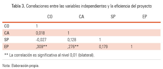 Posteriormente, se analizó la asociación entre las variables independientes, notándose que la mayor asociación la presentan las variables de capacitación y selección de personal (0,128), pero ninguna de ellas tiene significancia estadística, por lo que el problema de colinealidad, mostrado en los estudios de Belout y Gauvreau (2004), y Pinto y Prescott (1988), se elimina.