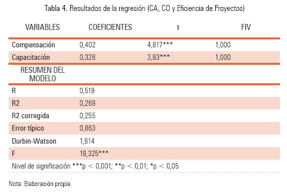 Al realizar un análisis más detallado del modelo, en la Tabla 4 se aprecia que la hipótesis H3 relativa al papel del reconocimiento de los empleados a través de compensaciones, tanto financieras como no financieras, en la eficiencia de proyectos es la que muestra una mayor influencia estadísticamente significativa y positiva, con un coeficiente de 0,402. Igualmente destacado es el papel de la implementación de programas de capacitación, con un coeficiente positivo y significativo de 0,328, con lo que se puede aceptar la hipótesis H1. Por su parte, aunque existe una asociación entre la selección del personal y la eficiencia de proyectos, se optó por eliminarla del modelo de regresión al no ser estadísticamente significativo, por lo que se rechaza la hipótesis H2.
