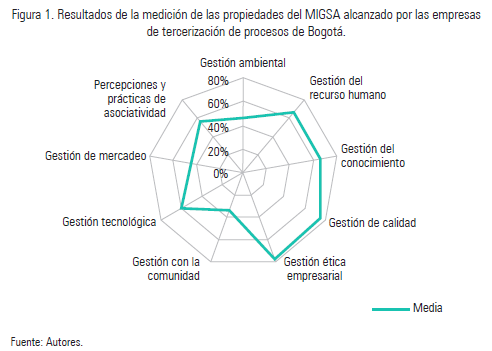 Los resultados del análisis realizado a las empresas de tercerización de procesos se presentarán en conjunto y de dos maneras diferentes. En la primera se muestran los resultados comparativos derivados de la evaluación que permite identificar, por medio de la estadística descriptiva, el alcance en el cumplimiento de políticas y prácticas de gestión para las nueve propiedades medidas por MIGSA: Gestión Ambiental, Gestión del Recurso Humano, Gestión del Conocimiento, Gestión de la Ética Empresarial, Gestión Tecnológica, Gestión con la Comunidad, Gestión de Calidad, Gestión de Mercadeo, y Percepciones y Prácticas de Asociatividad (Danna-Buitrago et al., 2014; Bohórquez Vidal, Ferrer, & Ramírez, 2014; Bohórquez et al., 2011).