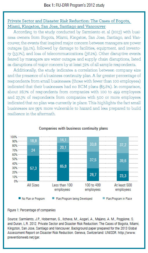 A study on Private Sector and DRR was led by FIU and supported by USAID/OFDA (Oftce of U.S. Foreign Disaster Assistance) and the UNISDR (United Nations Oftce for Disaster Reduction), in collaboration with researchers of the INCAE Business School (Costa Rica), the University of Chile, Ohio University, and York University (Canada). The study was conducted in six cities of the Americas in 2012: Bogotá (Colombia), Miami, FL (United States), San José (Costa Rica), Santiago (Chile), Kingston (Jamaica), and Vancouver (Canada).