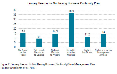 It is safe to say that building disaster resilience by preparing for disaster with a business continuity plan is vital for small business to thrive in the long run. More often than not, small business owners invest large sums of money, time, and resources to make their ventures successful and yet, many of them fail to properly plan and prepare for disaster situations (U.S. Small Business Administration, 2016). Possible explanations for this vary, ranging from small business owners' disbelief that a disaster would strike them, prohibitive costs, lack of resources, and general belief that a business continuity plan is not necessary (Hammock, 2015). Figure 2 describes business owners' reasons for not investing in a business continuity plan.
