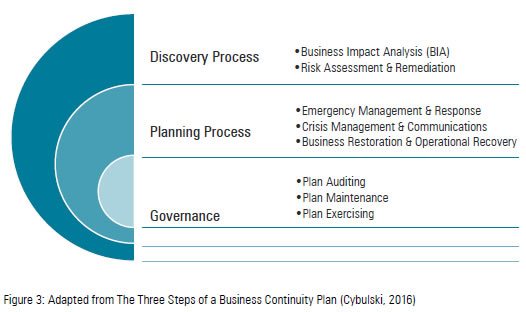 According to Aon Global Risk Consulting, three steps are essential when developing a business plan that is eftcient and complies with standards, codes and best practices: 1) the Discovery Phase, which consists of business impact analysis and risk assessment; 2) the Planning Phase, composed of the emergency response and management and crisis management and communications steps; and 3) the Governance Phase, which follows the plan auditing, updating and exercising procedures (Figure 3).