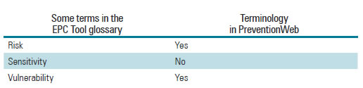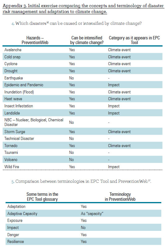 The first step is to improve EPC´s Framework and Tool, incorporating theoretical concepts, metrics and examples related to disaster risk management. An initial exercise comparing the concepts and terminology of both areas, adaptation and disaster risks, was made and is summarized in Appendix 3. Based on that exercise, changes will be implemented in the following steps of the Tool for elaboration of business adaptation strategies:
