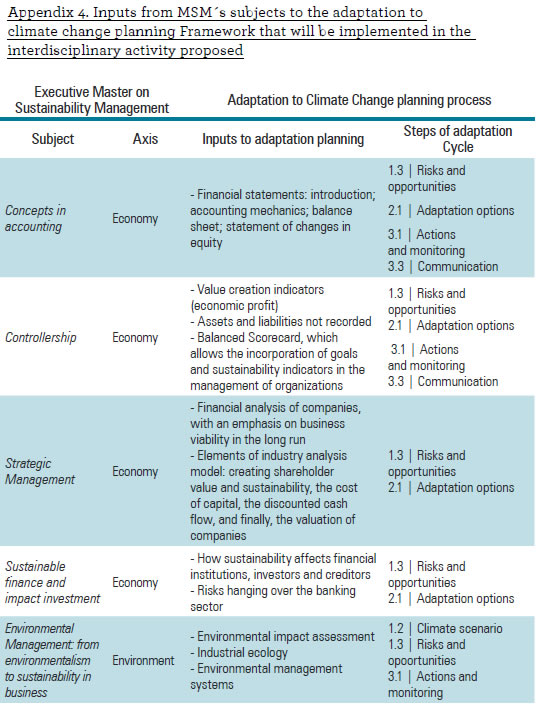 GVces can bring to the classroom the results of its own research on adaptation. Adaptation is a complex matter and requires a long-term view, dealing with uncertainty and knowledge from a great diversity of subjects. It is a good example of a ''wicked problem''11. However, there is no specific focus on adaptation to climate change in the Master in Sustainability Management.