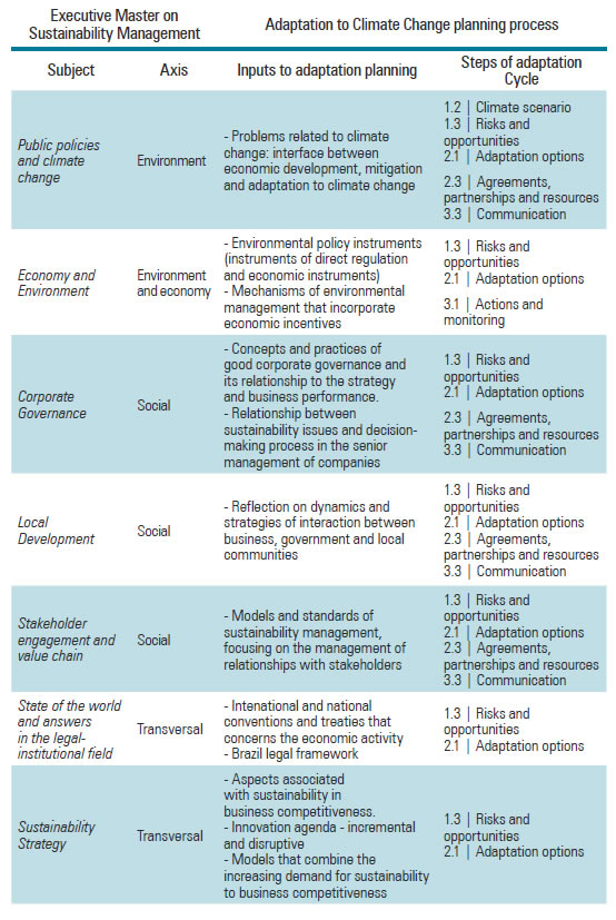 From the analysis of the syllabi, in the Master in Sustainability Management, climate change is explored and discussed from different perspectives, offering students a solid background on the subject. However, there is room to improve climate risk management, adaptation and disaster risk management in greater depth. Adaptation demands an interdisciplinary approach, but, more than that, the strengthening of leadership, communication and mobilization skills of the team leading this agenda within the organizations – a process which GVces has been accessing, studying and promoting especially on its Integrated Education for Sustainability (FIS) initiative (Appendix 1).