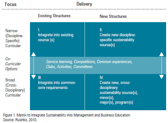 To assist in the effective integration of sustainability into management and business education, Rusinko (2010) proposes a matrix of options to its implementation (Figure 1): through existing structures or by creating new structures, and through discipline-specific focus or cross-disciplinary focus.