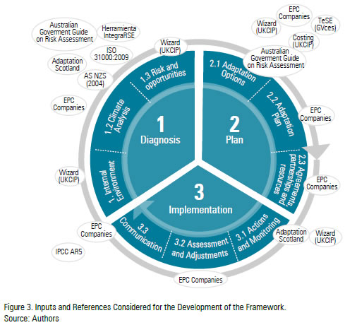In 2014, with the support of the German Agency for International Cooperation (GIZ) and based on the Latin America Adaptation Forum's outcomes, EPC held three workshops. It also created a working group with 25 of its member companies to co-build the Framework8 (Figure 2), which brings a step-by-step process to support the development of corporate strategies for climate change adaptation.