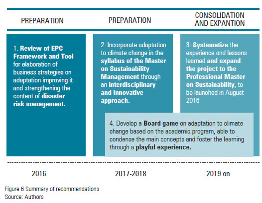 As presented in Section 5, MSM is consolidated at FGV. Around 20 professionals per year, of different business backgrounds, have attended this course for the last ten years. Reinforcing adaptation to climate change and disaster risk management in the syllabus of the course presents an opportunity to strengthen it. Adaptation is essentially an interdisciplinary subject and requires the articulation among areas and stakeholders. Based on our research experience and on the literature recommendations on how to integrate sustainability into business and management education, Recommendation 2 is composed by two key steps: