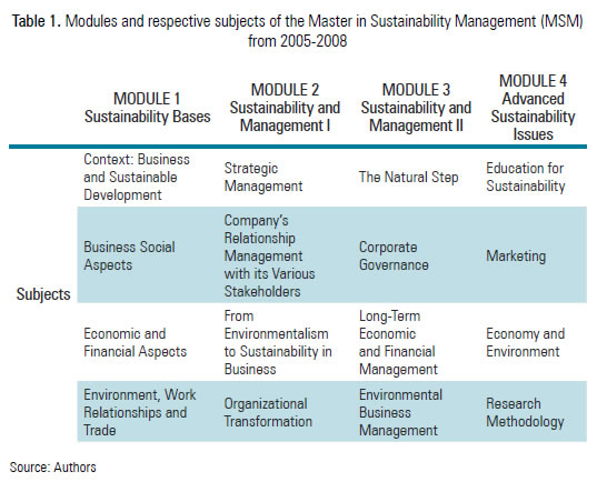 Between 2005 and 2008 the course was offered as a continuing education program and subjects were organized into four sequential modules, totaling 360 contact hours. Module 1 was about the sustainability bases, modules 2 and 3 focused on sustainability and management issues and, finally, module 4 was about advanced sustainability issues. All modules relied on subjects that addressed environmental, economic and social issues, as well as cross-cutting themes of sustainability, such as corporate governance. Once the modules were completed, students had to submit a final research report, demonstrating the application of accumulated knowledge in a structured, systematic and analytical way, supported by scientific method and proper bibliographic references. Additionally, through a partnership between FGV-EAESP and the École des Hautes Études Commerciales de Paris (HEC), students could go for an exchange semester in France in the Master Management du Développement Durable, an exclusive program for post-degree in sustainability.