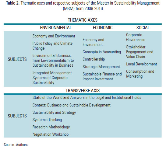 In order to conform to international quality standards, from 2009 on the course was offered in a master degree format, abandoning the division by modules and extending its hours from 380 contact hours to 484 contact hours. In its current format, the 18 course subjects are distributed around three thematic axes – environmental, economic and social – and around a transverse axis, consisting of subjects that cross and connect the themes, contributing to an integrated vision of sustainability. Still, once the disciplines are taken, students must deliver a final research report. Table 2 shows the above-mentioned axes and the subjects that are part of these axes.