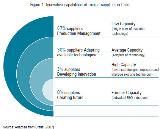 Thus, as depicted in figure N°1, most local suppliers operate in a context of production management and adaptation of available technologies. While only 3% of firms show advanced conditions that facilitate the development of innovation processing and/or the advanced design to improve existing technology. Nevertheless, there are no local suppliers whose activity is focused on expanding the knowledge frontier in mining, as seen in the figure below. In sum, the vast majority of Chilean mining suppliers tend to be less capable of developing new knowledge or innovations in their overall sector that will have positive effects on the mining industry and its value chain.