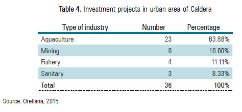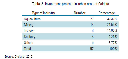 Local production activities are linked to investment in the primary sector, such as extraction and cultivation of aquaculture resources. The rest of investment projects are related to the export of mining products and activities to process fisheries and aquaculture products. The majority of these projects are located in the urban area of Caldera, as shown in table number 2.