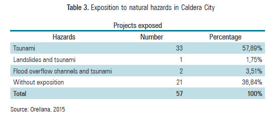 Economic activities in the Caldera urban area show a high level of vulnerability and potential fragility of investments. In fact, almost one half of the investments show a high level of exposure to natural hazards, while only 7% of investments show low levels of exposure. In terms of business preparedness, 90% of them would not find themselves suftciently prepared for an emergency and/or disaster (Orellana, 2015). The possibility of facing optimal and eftcient post-disaster recovery is hampered because skills are not suitable, augmented by the lack of public sector preparation tools. In this sense, investors have not considered the exposure to threats as critical to the security of their business and productive units. This case has been endorsed by the various local governments that have driven the investment allocation without clear policies of land use aimed at strengthening greater resilience of investment in the firms and employees established there.