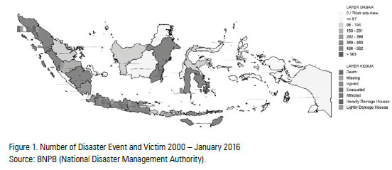 Statistics from the National Disaster Management Authority (BNPB) shows that in January 2016 alone, it recorded 174 disaster events that caused 20 casualties and missing people, 733,650 people have been displaced and 2,931 units of damaged homes. Figure 1 depicts how vulnerable Indonesia is to such disasters, as we can see the area highly affected by disasters (area in red) dominates the map, and the Java island where 70% of population is living, is also the most vulnerable area.